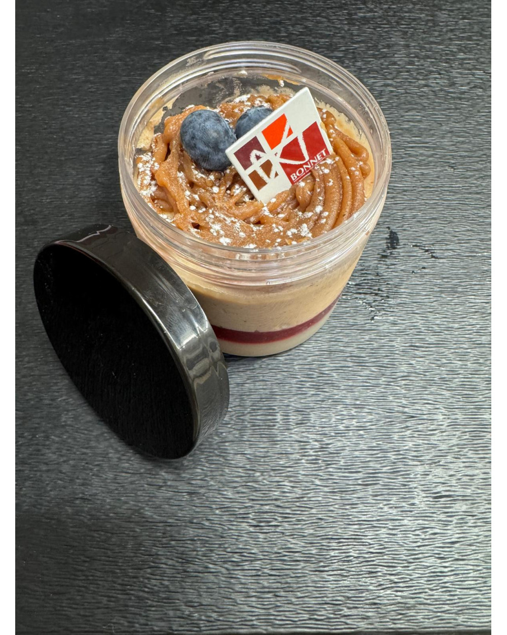 Compotée framboise litchi, biscuit Joconde, crème légère aux marrons