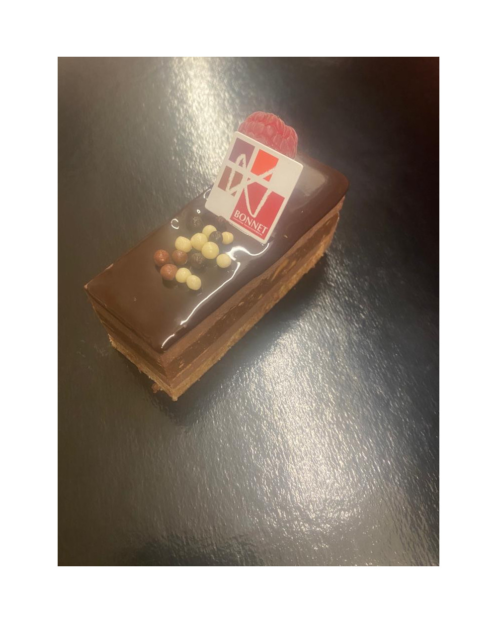 Biscuit Joconde, craquant chocolat et mousse chocolat framboise
