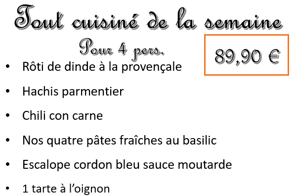 Nous vous proposons également la formule du tout cuisiné, qui contient 6 plats déjà préparés pour 4 personnes au tarif de 89,90 €